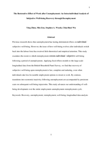 Previous research shows that unemployment has lasting detrimental effects on individuals’ subjective well-being. However, the issue of how well-being evolves after individuals switch back into the labour force has received little theoretical and empirical attention. This study examines the extent to which reemployment restores individuals’ subjective well-being following a period of unemployment. Applying fixed effects models to the large-scale longitudinal data from the British Household Panel Survey, we find that recovery of subjective well-being upon reemployment is fast, complete and enduring, even when individuals take less favourable employment options to return to work. By contrast, transitions into economic inactivity following unemployment are accompanied by persistent scars on subsequent well-being trajectories. This study advances our understanding of well-being development over the entire employment-unemployment-reemployment cycle.