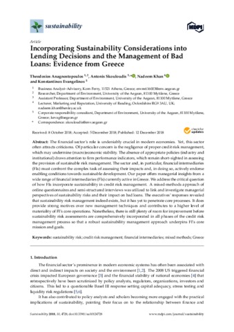 Anagnostopoulos, T., Skouloudis, A., Khan, N. orcid id iconORCID: https://orcid.org/0000-0001-6911-9737 and Evangelinos, K. (2018) Incorporating sustainability considerations into lending decisions and the management of bad loans: evidence from Greece. Sustainability, 10 (12). 4728. ISSN 2071-1050 doi: 10.3390/su10124728