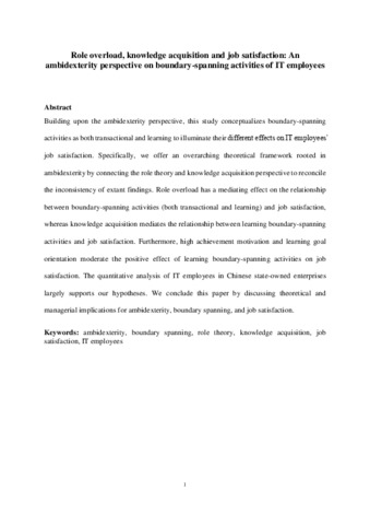 Wang, G., Liu, X. and Liu, Y. (2019) Role overload, knowledge acquisition and job satisfaction: an ambidexterity perspective on boundary-spanning activities of IT employees. The International Journal of Human Resource Management, 30 (4). pp. 728-757. ISSN 1466-4399 doi: 10.1080/09585192.2018.1494027