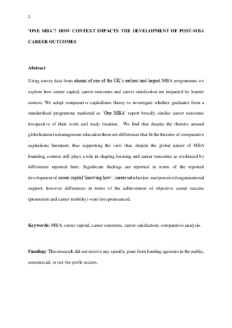 Using survey data from alumni of one of the UK’s earliest and largest MBA programmes we explore how career capital, career outcomes and career satisfaction are impacted by learner context. We adopt comparative capitalisms theory to investigate whether graduates from a standardised programme marketed as ‘One MBA’ report broadly similar career outcomes irrespective of their work and study location. We find that despite the rhetoric around globalisation in management education there are differences that fit the theories of comparative capitalisms literature; thus supporting the view that, despite the global nature of MBA branding, context still plays a role in shaping learning and career outcomes as evidenced by differences reported here. Significant findings are reported in terms of the reported development of career capital ‘knowing how’; career satisfaction and perceived organisational support, however differences in terms of the achievement of objective career success (promotion and career mobility) were less pronounced.