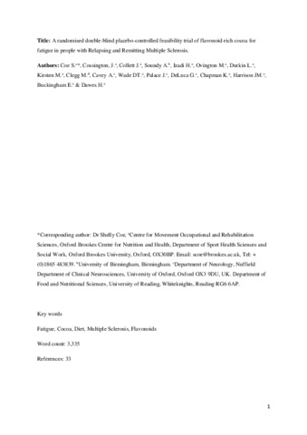 Coe, S., Cossington, J., Collett, J., Soundy, A., Izadi, H., Ovington, M., Durkin, L., Kirsten, M., Clegg, M., Cavey, A., Wade, D. T., Palace, J., DeLuca, G., Chapman, K., Harrison, J. M., Buckingham, E. and Dawes, H. (2019) A randomised double-blind placebo-controlled feasibility trial of flavonoid-rich cocoa for fatigue in people with relapsing and remitting multiple sclerosis. Journal of Neurology, Neurosurgery, and Psychiatry, 90. pp. 507-513. ISSN 1468-330X doi: 10.1136/jnnp-2018-319496