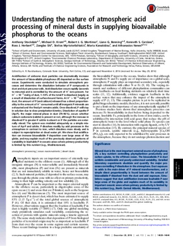 Stockdale, A., Krom, M. D., Mortimer, R. J. G., Benning, L. G., Carslaw, K. S., Herbert, R., Shi, Z., Myriokefalitakis, S., Kanakidou, M. and Nenes, A. (2016) Understanding the nature of atmospheric acid processing of mineral dusts in supplying bioavailable phosphorus to the oceans. Proceedings of the National Academy of Sciences of the United States of America, 113 (51). pp. 14639-14644. ISSN 0027-8424 doi: 10.1073/pnas.1608136113