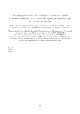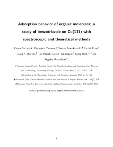Gattinoni, C., Tsaousis, P., Euaruksakul, C., Price, R., Duncan, D. A., Pascal, T., Prendergast, D., Held, G. and Michaelides, A. (2019) Adsorption behavior of organic molecules: a study of benzotriazole on Cu(111) with spectroscopic and theoretical methods. Langmuir, 35 (4). pp. 882-893. ISSN 0743-7463 doi: 10.1021/acs.langmuir.8b03528