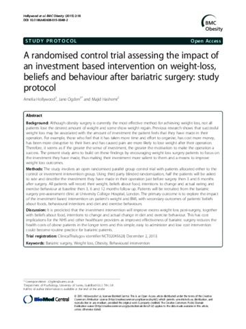 Background: Although obesity surgery is currently the most effective method for achieving weight loss, not all patients lose the desired amount of weight and some show weight regain. Previous research shows that successful weight loss may be associated with the amount of investment the patient feels that they have made in their operation. For example, those who feel that it has taken more time and effort to organise, has cost more money, has been more disruptive to their lives and has caused pain are more likely to lose weight after their operation. Therefore, it seems as if the greater the sense of investment, the greater the motivation to make the operation a success. The present study aims to build on these findings by encouraging weight loss surgery patients to focus on the investment they have made, thus making their investment more salient to them and a means to improve weight loss outcomes. Methods: The study involves an open randomised parallel group control trial with patients allocated either to the control or investment intervention group. Using third party blinded randomization, half the patients will be asked to rate and describe the investment they have made in their operation just before surgery then 3 and 6 months after surgery. All patients will record their weight, beliefs about food, intentions to change and actual eating and exercise behaviour at baseline then 3, 6 and 12 months follow up. Patients will be recruited from the bariatric surgery pre-assessment clinic at University College Hospital, London. The primary outcome is to explore the impact of the investment based intervention on patient’s weight and BMI, with secondary outcomes of patients’ beliefs about foods, behavioural intentions and diet and exercise behaviours. Discussion: It is predicted that the investment intervention will improve excess weight loss post-surgery, together with beliefs about food, intentions to change and actual change in diet and exercise behaviour. This has cost implications for the NHS and other healthcare providers as improved effectiveness of bariatric surgery reduces the health costs of obese patients in the longer term and this simple, easy to administer and low cost intervention could become routine practice for bariatric patients. Trial registration: ClinicalTrials.gov identifier NCT02045628; December 2, 2013.