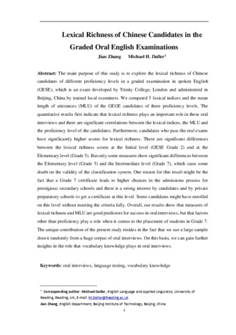 The main purpose of this study is to explore the lexical richness of Chinese candidates of different proficiency levels in a graded examination in spoken English (GESE), which is an exam developed by Trinity College, London and administered in Beijing, China by trained local examiners. We compared 5 lexical indices and the mean length of utterances (MLU) of the GEGE candidates of three proficiency levels. The quantitative results first indicate that lexical richness plays an important role in these oral interviews and there are significant correlations between the lexical indices, the MLU and the proficiency level of the candidates. Furthermore, candidates who pass the oral exams have significantly higher scores for lexical richness. There are significant differences between the lexical richness scores at the Initial level (GESE Grade 2) and at the Elementary level (Grade 5). But only some measures show significant differences between the Elementary level (Grade 5) and the Intermediate level (Grade 7), which casts some doubt on the validity of the classification system. One reason for this result might be the fact that a Grade 7 certificate leads to higher chances in the admissions process for prestigious secondary schools and there is a strong interest by candidates and by private preparatory schools to get a certificate at this level. Some candidates might have enrolled on this level without meeting the criteria fully. Overall, our results show that measures of lexical richness and MLU are good predictors for success in oral interviews, but that factors other than proficiency play a role when it comes to the placement of students in Grade 7. The unique contribution of the present study resides in the fact that we use a large sample drawn randomly from a huge corpus of oral interviews. On this basis, we can gain further insights in the role that vocabulary knowledge plays in oral interviews.