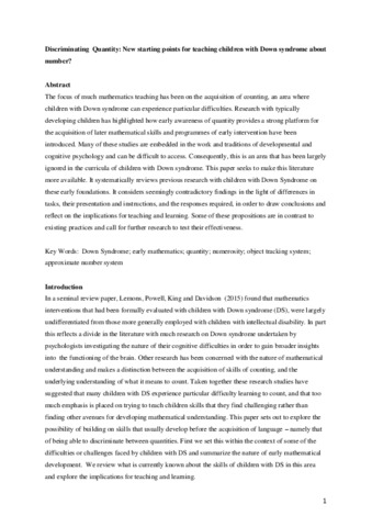 Porter, J. (2019) Discriminating quantity: new starting points for teaching children with Down syndrome about number? International Journal of Disability, Development and Education, 66 (2). pp. 133-150. ISSN 1034-912X doi: 10.1080/1034912X.2019.1569208