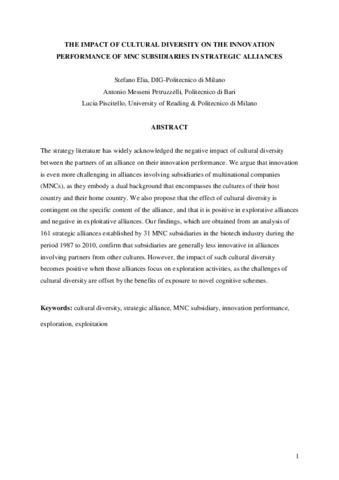 Elia, S., Messeni Petruzzelli, A. and Piscitello, L. (2019) The impact of cultural diversity on the innovation performance of MNC subsidiaries in strategic alliances. Journal of Business Research, 98. pp. 204-213. ISSN 0148-2963 doi: 10.1016/j.jbusres.2019.01.062