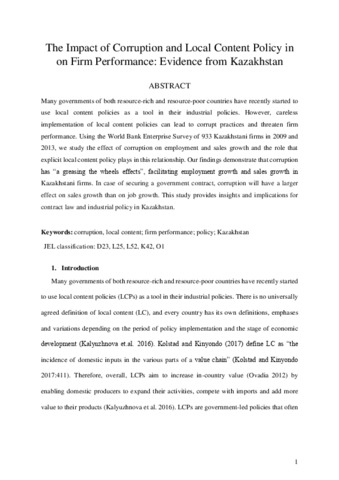 Many governments of both resource-rich and resource-poor countries have recently started to use local content policies as a tool in their industrial policies. However, careless implementation of local content policies can lead to corrupt practices and threaten firm performance. Using the World Bank Enterprise Survey of 933 Kazakhstani firms in 2009 and 2013, we study the effect of corruption on employment and sales growth and the role that explicit local content policy plays in this relationship. Our findings demonstrate that corruption has “a greasing the wheels effects”, facilitating employment growth and sales growth in Kazakhstani firms. In case of securing a government contract, corruption will have a larger effect on sales growth than on job growth. This study provides insights and implications for contract law and industrial policy in Kazakhstan.
