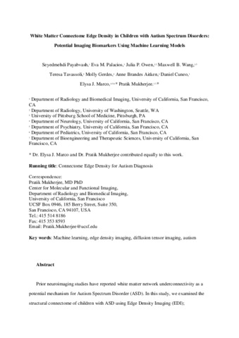 Payabvash, S., Palacios, E., Owen, J. P., Wang, M. B., Tavassoli, T. orcid id iconORCID: https://orcid.org/0000-0002-7898-2994, Gerdes, M. R., Brandes Aitken, A., Cuneo, D., Marco, E. and Mukherjee, P. (2019) White matter connectome edge density in children with Autism Spectrum Disorders: potential imaging biomarkers using machine learning models. Brain Conenctivity, 9 (2). ISSN 2158-0014 doi: 10.1089/brain.2018.0658