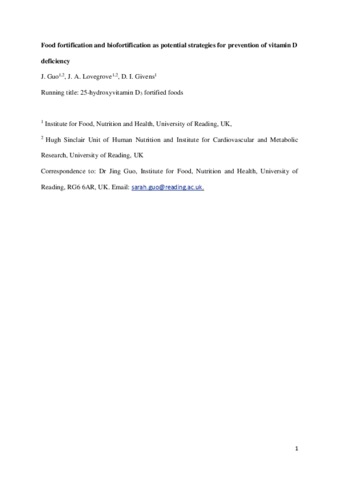 Guo, J., Lovegrove, J. A. orcid id iconORCID: https://orcid.org/0000-0001-7633-9455 and Givens, D. I. orcid id iconORCID: https://orcid.org/0000-0002-6754-6935 (2019) Food fortification and biofortification as potential strategies for prevention of vitamin D deficiency. Nutrition Bulletin, 44 (1). pp. 36-42. ISSN 1471-9827 doi: 10.1111/nbu.12363