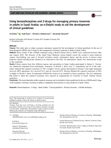 Dobia, A., Ryan, K., BaHammam, A. and Edwards, A. orcid id iconORCID: https://orcid.org/0000-0003-2369-989X (2019) Using benzodiazepines and Z-Drugs for managing primary insomnia in adults in Saudi Arabia: an e-Delphi study to aid the development of clinical guidelines. Sleep and Breathing, 23 (4). pp. 1133-1139. ISSN 1520-9512 doi: 10.1007/s11325-019-01794-7