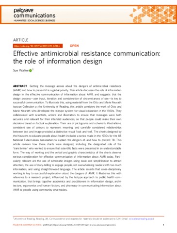 Getting the message across about the dangers of antimicrobial resistance (AMR) and how to prevent it is a global priority. This article discusses the role of information design in the effective communication of information about AMR, and suggests that the design process – user input, iteration and consideration of circumstances of use – is key to successful communication. To illustrate this, using material from the Otto and Marie Neurath Isotype Collection at the University of Reading, this article considers the work of Otto and Marie Neurath who developed the Isotype system for visual education in the 1920s. They collaborated with scientists, writers and illustrators to ensure that messages were both accurate and relevant for their intended audiences, so that people could make their own decisions based on factual explanation. Their use of pictograms and schematic illustrations, consistent use of colours to represent meaning, and carefully considered relationships between text and image provided a distinctive visual ‘look and feel’. The charts designed by the Neuraths to educate people about health included a series made in the 1930s for the US National Tuberculosis Association to explain the dangers of, and how to prevent TB. This article reviews how these charts were designed, including the designated role of the ‘transformer’ who worked to ensure that scientific facts were presented in an understandable form. The way of working and the verbal and graphic characteristics of the charts deserve serious consideration for effective communication of information about AMR today. Particularly relevant are the use of schematic images using scale and simplification to attract attention, the use of story-telling to engage people, not overwhelming readers with too much information, and using straightforward language. The article asserts that cross-disciplinary working is key to successful explanation about the dangers of AMR. It illustrates this with reference to a research project, influenced by the Isotype approach to public health communication, that brings together academics and practitioners in information design, architecture, ergonomics and human factors, and pharmacy in communicating information about AMR to people using community pharmacies.