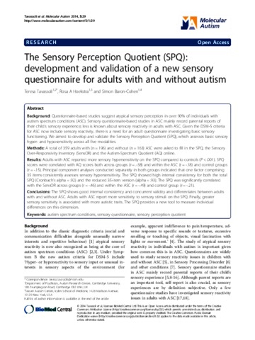 The Sensory Perception Quotient (SPQ): development and validation of a new sensory questionnaire for adults with and without autism.