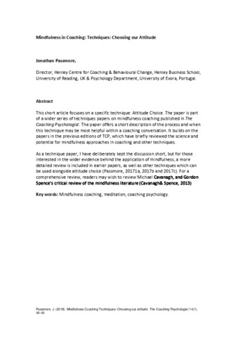 This short article focuses on a specific technique: Attitude Choice. The paper is part of a wider series of techniques papers on mindfulness coaching published in The Coaching Psychologist. The paper offers a short description of the process and when this technique may be most helpful within a coaching conversation. It builds on the papers in the previous editions of TCP, which have briefly reviewed the science and potential for mindfulness approaches in coaching and other techniques. As a technique paper, I have deliberately kept the discussion short, but for those interested in the wider evidence behind the application of mindfulness, a more detailed review is included in earlier papers, as well as other techniques which can be used alongside attitude choice (Passmore, 20171a, 2017b and 2017c). For a comprehensive review, readers may wish to review Michael Cavanagh, and Gordon Spence’s critical review of the mindfulness literature (Cavanagh & Spence, 2013).