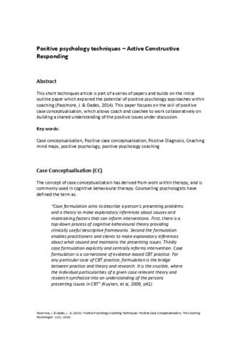 This short techniques article is part of a series of papers and builds on the initial outline paper which explored the potential of positive psychology approaches within coaching (Passmore, J. & Oades, 2014). This paper focuses on the skill of positive case conceptualisation, which allows coach and coachee to work collaboratively on building a shared understanding of the positive issues under discussion.