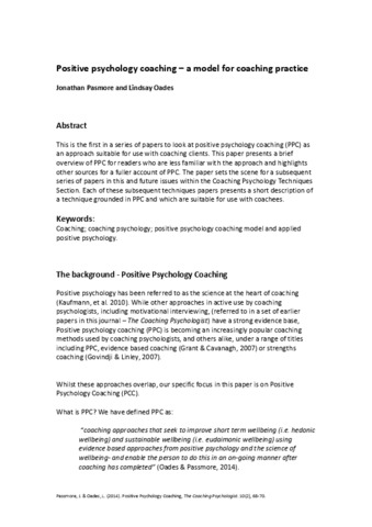 Passmore, J. orcid id iconORCID: https://orcid.org/0000-0003-0832-7510 and Oades, L. G. (2014) Positive psychology coaching: a model for coaching practice. The Coaching Psychologist, 10 (2). pp. 68-70. ISSN 1748-1104