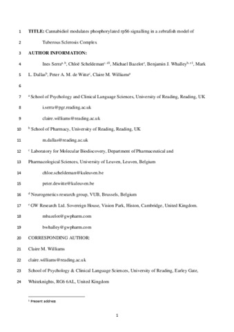 Serra, I., Scheldeman, C., Bazelot, M., Whalley, B. J., Dallas, M. L. orcid id iconORCID: https://orcid.org/0000-0002-5190-0522, De Witte, P. A. M. and Williams, C. M. orcid id iconORCID: https://orcid.org/0000-0003-4452-671X (2019) Cannabidiol modulates phosphorylated rpS6 signalling in a zebrafish model of tuberous sclerosis complex. Behavioural Brain Research, 363. pp. 135-144. ISSN 0166-4328 doi: 10.1016/j.bbr.2019.01.040