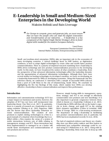 Small- and medium-sized enterprises (SMEs) play an important role in the economies of many developing countries. A critical challenge faced by SME leaders, as digitization continues, is how to adopt digital technologies to create value and enable faster product commercialization. There is a paucity of empirical research examining how e-leadership in SMEs drives technology and new product commercialization processes in the developing world. In this study, we have broadened the notion of what constitutes e-leadership, from the perspective of how advanced information technologies affect the leadership dynamic and the appropriation of advanced information technologies. Although there have been several studies on leading technologies in developed countries, we focus on developing an e-leadership framework for SMEs in developing economies. Using this framework and five selection criteria, we conducted 11 interviews with a sample of successful SMEs selected from a pool of 2,240 firms in the city of Johannesburg, South Africa. We conclude by highlighting the five key findings of this study, which explain how SMEs can develop effective e-leadership to foster commercialization and improve firm performance.