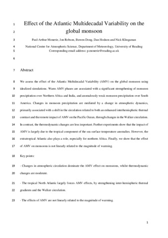 Monerie, P.-A. orcid id iconORCID: https://orcid.org/0000-0002-5304-9559, Robson, J. orcid id iconORCID: https://orcid.org/0000-0002-3467-018X, Dong, B. orcid id iconORCID: https://orcid.org/0000-0003-0809-7911, Hodson, D. L. R. orcid id iconORCID: https://orcid.org/0000-0001-7159-6700 and Klingaman, N. P. orcid id iconORCID: https://orcid.org/0000-0002-2927-9303 (2019) Effect of the Atlantic Multidecadal Variability on the global monsoon. Geophysical Research Letters, 46 (3). pp. 1765-1775. ISSN 0094-8276 doi: 10.1029/2018GL080903