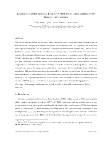 Ojha, V. K. orcid id iconORCID: https://orcid.org/0000-0002-9256-1192, Abraham, A. and Snásel, V. (2017) Ensemble of heterogeneous flexible neural trees using multiobjective genetic programming. Applied Soft Computing, 52. pp. 909-924. ISSN 1568-4946 doi: 10.1016/j.asoc.2016.09.035