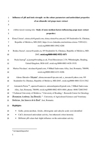 Cristea, E., Sturza, R., Jauregi, P., Niculaua, M., Ghendov-Moșanu, A. and Patras, A. (2019) Influence of pH and ionic strength on the color parameters and antioxidant properties of an ethanolic red grape marc extract. Journal of Food Biochemistry, 43 (4). e12788. ISSN 1745-4514 doi: 10.1111/jfbc.12788