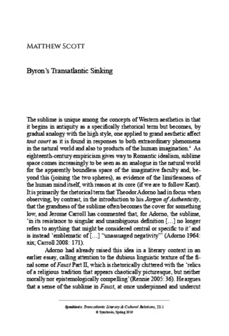 Scott, M. (2019) Byron's transatlantic sinking. Symbiosis: Transatlantic Literary and Cultural Relations, 23 (1). ISSN 1362-7902