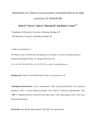 Towers, M. W., McKendrick, J. E. orcid id iconORCID: https://orcid.org/0000-0003-2275-0569 and Cramer, R. orcid id iconORCID: https://orcid.org/0000-0002-8037-2511 (2010) Introduction of 4-chloro-alpha-cyanocinnamic acid liquid matrices for high sensitivity UV-MALDI MS. Journal of Proteome Research, 9 (4). pp. 1931-1940. ISSN 1535-3893 doi: 10.1021/pr901089j