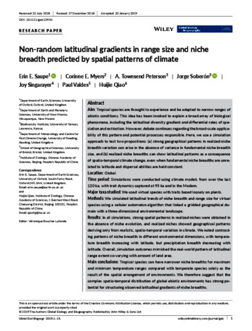 Saupe, E., Myers, C., Peterson, A. T., Soberon, J., Singarayer, J., Valdes, P. and Qiao, H. (2019) Non-random latitudinal gradients in range size and niche breadth predicted by spatial patterns of climate. Global Ecology and Biogeography, 28 (7). pp. 928-942. ISSN 1466-8238 doi: 10.1111/geb.12904