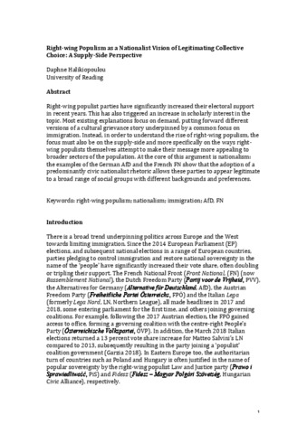 Halikiopoulou, D. (2019) Right-wing populism as a nationalist vision of legitimating collective choice: a supply-side perspective. The International Spectator, 54 (2). pp. 35-49. ISSN 0393-2729 doi: 10.1080/03932729.2019.1588544
