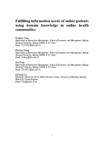 Chen, D., Zhang, R., Feng, J. and Liu, K. (2020) Fulfilling information needs of online patients using domain knowledge in online health communities. Health Information & Libraries Journal, 37 (1). pp. 48-59. ISSN 1471-1842 doi: 10.1111/hir.12253