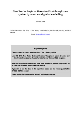 Lane, D. orcid id iconORCID: https://orcid.org/0000-0001-6658-7041 (2019) New truths begin as heresies: first thoughts on system dynamics and global modelling. Systems Research and Behavioral Science, 36 (2). pp. 233-243. ISSN 1099-1743 doi: 10.1002/sres.2585