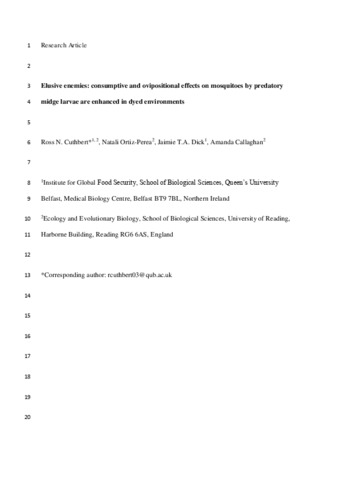 Elusive enemies: consumptive and ovipositional effects on mosquitoes by predatory midge larvae are enhanced in dyed environments.