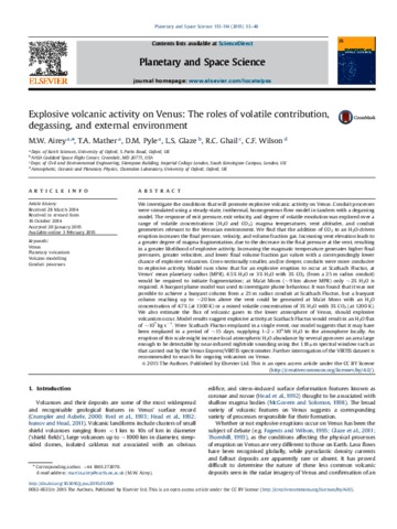 Airey, M. W. orcid id iconORCID: https://orcid.org/0000-0002-9784-0043, Mather, T. A., Pyle, D. M., Glaze, L. S., Ghail, R. C. and Wilson, C. F. (2015) Explosive volcanic activity on Venus: The roles of volatile contribution, degassing, and external environment. Planetary and Space Science, 113 - 114. 33 - 48. ISSN 0032-0633 doi: 10.1016/j.pss.2015.01.009