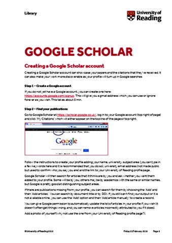 CentAUR (2019) Google Scholar: creating a Google Scholar account. [CentAUR Administrative Document] (Unpublished)