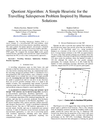 Kyritsis, M. orcid id iconORCID: https://orcid.org/0000-0002-7151-1698, Ud Din, S. and Gulliver, S. orcid id iconORCID: https://orcid.org/0000-0002-4503-5448 (2018) Quotient algorithm: a simple heuristic for the travelling salesperson problem inspired by human solutions. In: 2018 Fifth HCT Information Technology Trends (ITT), 28-29 Nov 2018, Dubai, United Arab Emirates, pp. 47-49.
