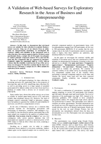 In this study, we demonstrate that web-based surveys are suitable for data collection in academic Business-related research. Using one of our datasets from an online study on entrepreneurial orientation, we investigated the construct validity and reliability of the instrument used to collect the data. Our analysis supports that for 28 Likert-scaled questionnaire items, a sample size of 332 people was adequate to conduct principle component analysis (PCA) and load the items into five components that are supported by literature. Cronbach’s alpha was consistently high (α = 0.92), with no evidence that the reliability would increase if any of the survey items were dropped. We therefore conclude that for short web-based surveys (<30 items), a sample size of > 300 is suitable for exploratory factor analysis.
