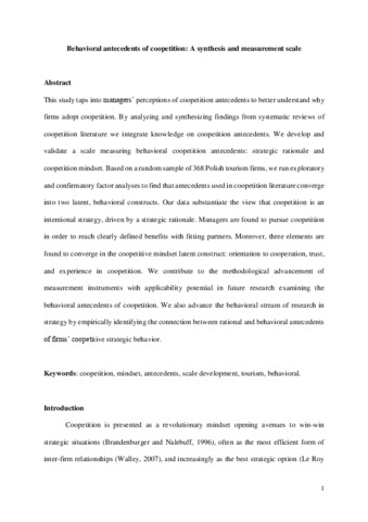 This study taps into managers’ perceptions of coopetition antecedents to better understand why firms adopt coopetition. By analyzing and synthesizing findings from systematic reviews of coopetition literature we integrate knowledge on coopetition antecedents. We develop and validate a scale measuring behavioral coopetition antecedents: strategic rationale and coopetition mindset. Based on a random sample of 368 Polish tourism firms, we run exploratory and confirmatory factor analyses to find that antecedents used in coopetition literature converge into two latent, behavioral constructs. Our data substantiate the view that coopetition is an intentional strategy, driven by a strategic rationale. Managers are found to pursue coopetition in order to reach clearly defined benefits with fitting partners. Moreover, three elements are found to converge in the coopetitive mindset latent construct: orientation to cooperation, trust, and experience in coopetition. We contribute to the methodological advancement of measurement instruments with applicability potential in future research examining the behavioral antecedents of coopetition. We also advance the behavioral stream of research in strategy by empirically identifying the connection between rational and behavioral antecedents of firms’ coopetitive strategic behavior.