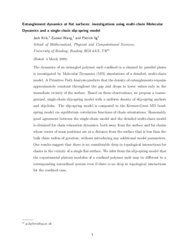 Kirk, J., Wang, Z. and Ilg, P. orcid id iconORCID: https://orcid.org/0000-0002-7518-5543 (2019) Entanglement dynamics at flat surfaces: investigations using multi-chain molecular dynamics and a single-chain slip-spring model. The Journal of Chemical Physics, 150 (9). 094906. ISSN 0021-9606 doi: 10.1063/1.5045301