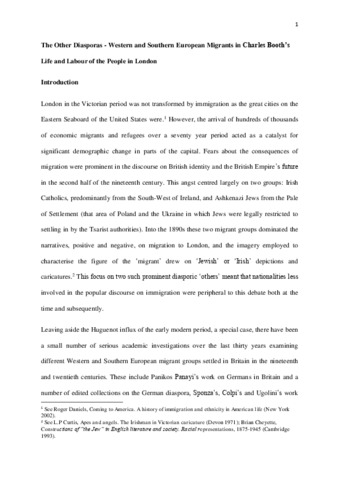 This article analyses the discourse surrounding diaspora in Life and Labour of the People in London, drawing upon the published volumes of the project and the unpublished notebooks used to record observations and interviews. It examines how Western and Southern European migrant groups in London were depicted in Charles Booth’s work at the turn of the twentieth century, comparing these depictions with those of the Irish Catholic and Jewish Diasporas. It focuses on four areas through which the concept of diaspora was interrogated in Life and Labour – ideas of territory, economic roles, criminality, and the nature of transnational institutions. It will demonstrate how these groups experienced differences in patterns of settlement and in interactions with the host society, and why between 1890 and 1914 Western and Southern European diasporas never attracted the attention or the opprobrium so apparent in the discourse on Irish and Jewish migrants.