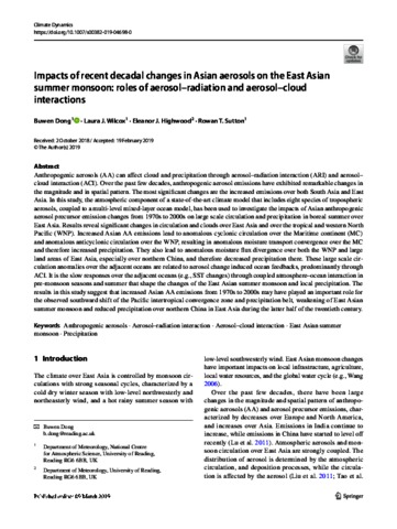 Impacts of recent decadal changes in Asian aerosols on the East Asian summer monsoon: roles of aerosol–radiation and aerosol–cloud interactions.