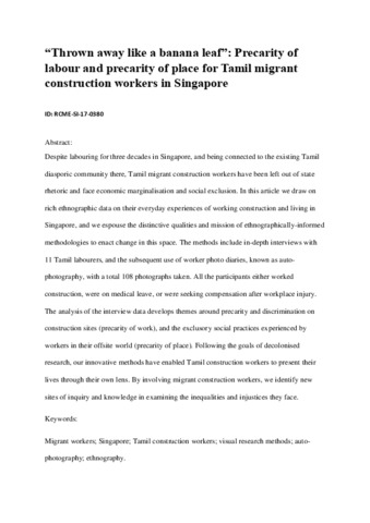 “Thrown away like a banana leaf”: precarity of labour and precarity of place for Tamil migrant construction workers in Singapore.