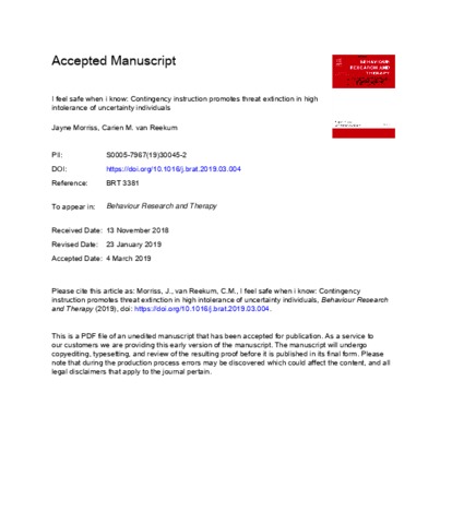 Morriss, J. and van Reekum, C. M. orcid id iconORCID: https://orcid.org/0000-0002-1516-1101 (2019) I feel safe when i know: contingency instruction promotes threat extinction in high intolerance of uncertainty individuals. Behaviour Research and Therapy, 116. pp. 111-118. ISSN 0005-7967 doi: 10.1016/j.brat.2019.03.004