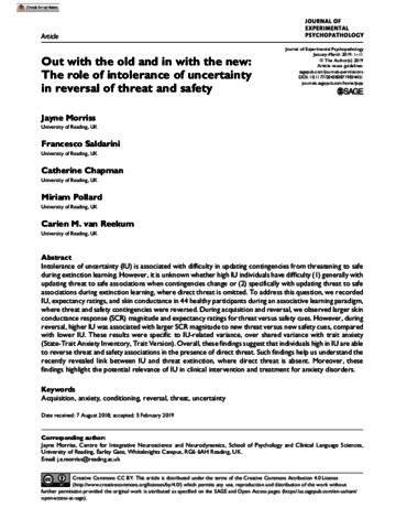 Out with the old and in with the new: the role of intolerance of uncertainty in reversal of threat and safety.