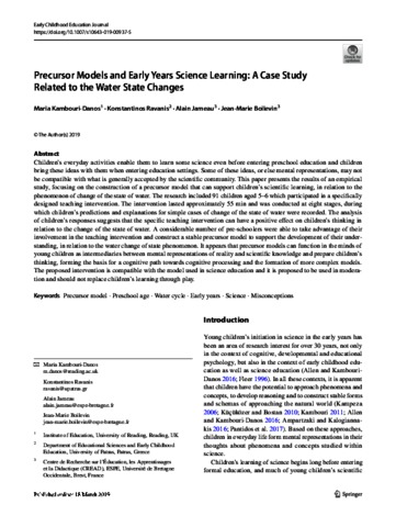 Children’s everyday activities enable them to learn some science even before entering preschool education and children bring these ideas with them when entering education settings. Some of these ideas, or else mental representations, may not be compatible with what is generally accepted by the scientific community. This paper presents the results of an empirical study, focusing on the construction of a precursor model that can support children’s scientific learning, in relation to the phenomenon of change of the state of water. The research included 91 children aged 5-6 which participated in a specifically designed teaching intervention. The intervention lasted approximately 55 minutes and was conducted at eight stages, during which children’s predictions and explanations for simple cases of change of the state of water were recorded. The analysis of children’s responses suggests that the specific teaching intervention can have a positive effect on children’s thinking in relation to the change of the state of water. A considerable number of pre-schoolers were able to take advantage of their involvement in the teaching intervention and construct a stable precursor model to support the development of their understanding, in relation to the water change of state phenomenon. It appears that precursor models can function in the minds of young children as intermediaries between mental representations of reality and scientific knowledge and prepare children’s thinking, by forming the basis for a cognitive path towards cognitive processing and the formation of more complex models. The proposed intervention is compatible with the model used in science education and it is proposed to be used in moderation and should not replace children’s learning through play.