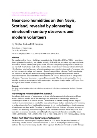 The weather on Ben Nevis – the highest mountain in the British Isles, 1345 m AMSL – sometimes shows episodes of remarkably low relative humidity (RH) with few precedents anywhere else in the British Isles. We are able to quantify this for the first time using a high-quality series of hourly dry- and wet-bulb observations, made on the summit. These observations were made between 1883 and 1904, but have only just become available to modern science, thanks to thousands of volunteers who worked to rescue this unique and exemplary dataset from published volumes. Careful examination and analysis of the original observations using modern psychrometric theory revealed several occasions where we are confident that the summit RH fell close to zero as a result of anticyclonic subsidence. Three case histories are examined in some detail. The nineteenth-century Ben Nevis humidity records are also compared with contemporary automatic weather station (AWS) data from two high-altitude Scottish mountain sites.