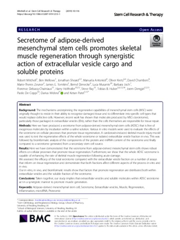 Mitchell, R., Mellows, B., Sheard, J., Antonioli, M., Kretz, O., Chambers, D., Zeuner, M.-T., Tomkins, J. E., Denecke, B., Musante, L., Joch, B., Debacq-Chainiaux, F., Holthofer, H., Ray, S., Huber, T. B., Dengjel, J., De Coppi, P., Widera, D. orcid id iconORCID: https://orcid.org/0000-0003-1686-130X and Patel, K. (2019) Secretome of adipose-derived mesenchymal stem cells promotes skeletal muscle regeneration through synergistic action of extracellular vesicle cargo and soluble proteins. Stem Cell Research and Therapy, 10. 116. ISSN 1757-6512 doi: 10.1186/s13287-019-1213-1
