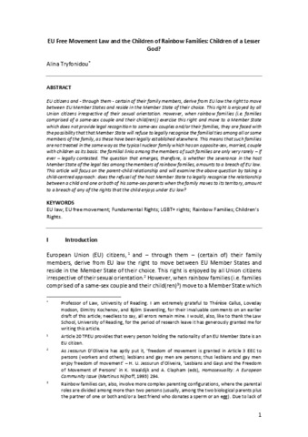 EU citizens and - through them - certain of their family members, derive from EU law the right to move between EU Member States and reside in the Member State of their choice. However, when rainbow families (i.e. families comprised of a same-sex couple and their child(ren)) exercise this right and move to a Member State which does not provide legal recognition to same-sex couples and/or their families, they are faced with the possibility that that Member State will refuse to legally recognise the familial ties among all or some members of the family, as these have been legally established elsewhere. The question that emerges, therefore, is whether the severance in the host Member State of the legal ties among the members of rainbow families, amounts to a breach of EU law. This article will focus on the parent-child relationship and will examine the above question by taking a child-centred approach: does the refusal of the host Member State to legally recognise the relationship between a child and one or both of his same-sex parents when the family moves to its territory, amount to a breach of any of the rights that the child enjoys under EU law?
