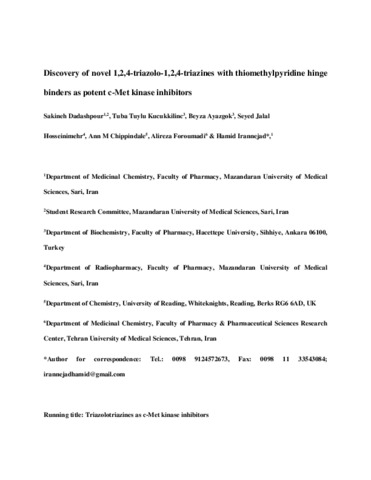 Dadashpour, S., Kucukkilinc, T. T., Ayazgok, B., Hosseinimehr, S. J., Chippindale, A. orcid id iconORCID: https://orcid.org/0000-0002-5918-8701, Foroumadi, A. and Irannejad, H. (2019) Discovery of novel 1,2,4-triazolo-1,2,4-triazines with thiomethylpyridine hinge binders as potent c-Met kinase inhibitors. Future Medicinal Chemistry, 11 (10). pp. 1119-1136. ISSN 1756-8927 doi: 10.4155/fmc-2018-0412