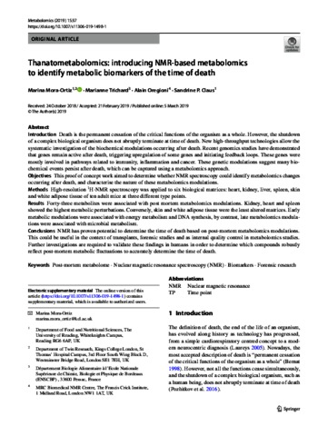 Mora-Ortiz, M., Trichard, M., Oregioni, A. and Claus, S. P. (2019) Thanatometabolomics: introducing NMR-based metabolomics to identify metabolic biomarkers of the time of death. Metabolomics, 15. 37. ISSN 1573-3890 doi: 10.1007/s11306-019-1498-1