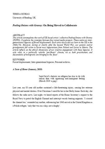 Murjas, T. orcid id iconORCID: https://orcid.org/0000-0002-1280-7149 (2019) Peeling onions with Granny: on being moved to collaborate. Performing Ethos, 9 (1). pp. 37-53. ISSN 1757-1987 doi: 10.1386/peet_00004_1